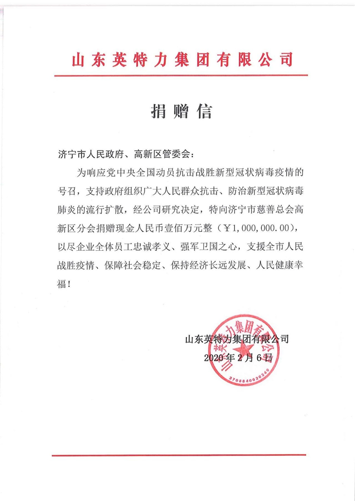 ![]() 自新型冠狀肺炎疫情爆發以來,一向牽動著英特力人的心。2月6日山東英特力集團有限公司特向濟寧市慈善總會高新區分會捐贈現金人民幣壹佰萬元整(¥1,000,000.00),以盡企業全體員工忠誠孝義、強軍衛國之心,支援全市人民克服疫情、保障社會穩固、人民健康幸福! ![]() 眾擎易舉、共克時艱。在黨中間、各級當局同一頑強的向導下,英特力人將繼承積極自動承擔起同舟共濟的社會責任,與全國人民一路齊心協力打贏這場疫情防控戰。 |
